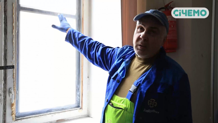 «Зараз ми прийшли на дев’яносту п’яту гімназію, щоби замінити ось ці вікна, які забиті плитами ОСБ, на ось такі, більш, скажімо так, сучасні і прозорі, і тепло- енергозберігаючі вікна,» — каже робітник Борис Стрельников.