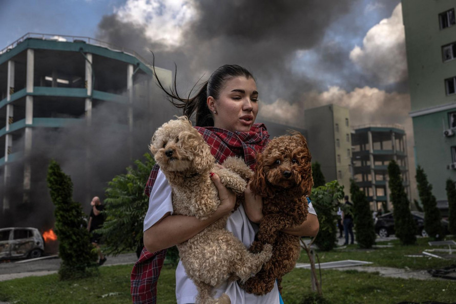 Ще на одному фото з України жінка несе домашніх тварин, втікаючи зі свого будинку після вибуху російських бомб у районі Харкова 24 липня. Автор фото: Девід Гуттенфельдер, The New York Times.