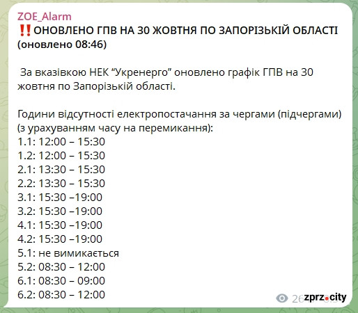 Оновлено об 14.14. За вказівкою НЕК «Укренерго» оновлений графік ГПВ на 30 жовтня по Запорізькій області, з 15:30 до 19:00 вимикається 1 черга.