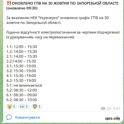 Оновлено об 11.02. За командою НЕК «Укренерго» графік погодинних відключень на 30 жовтня по Запорізькій області наразі скасовано. Ситуація в Об’єднаній енергосистемі динамічно змінюється. Слідкуйте за інформацією Запоріжжяобленерго.
