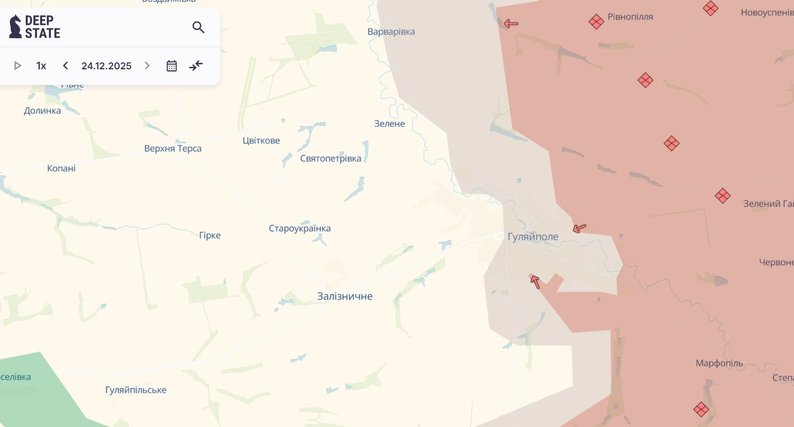 Карта бойових дій у Запорізькому регіоні, 24 грудня 2025 рік. DeepStateMap