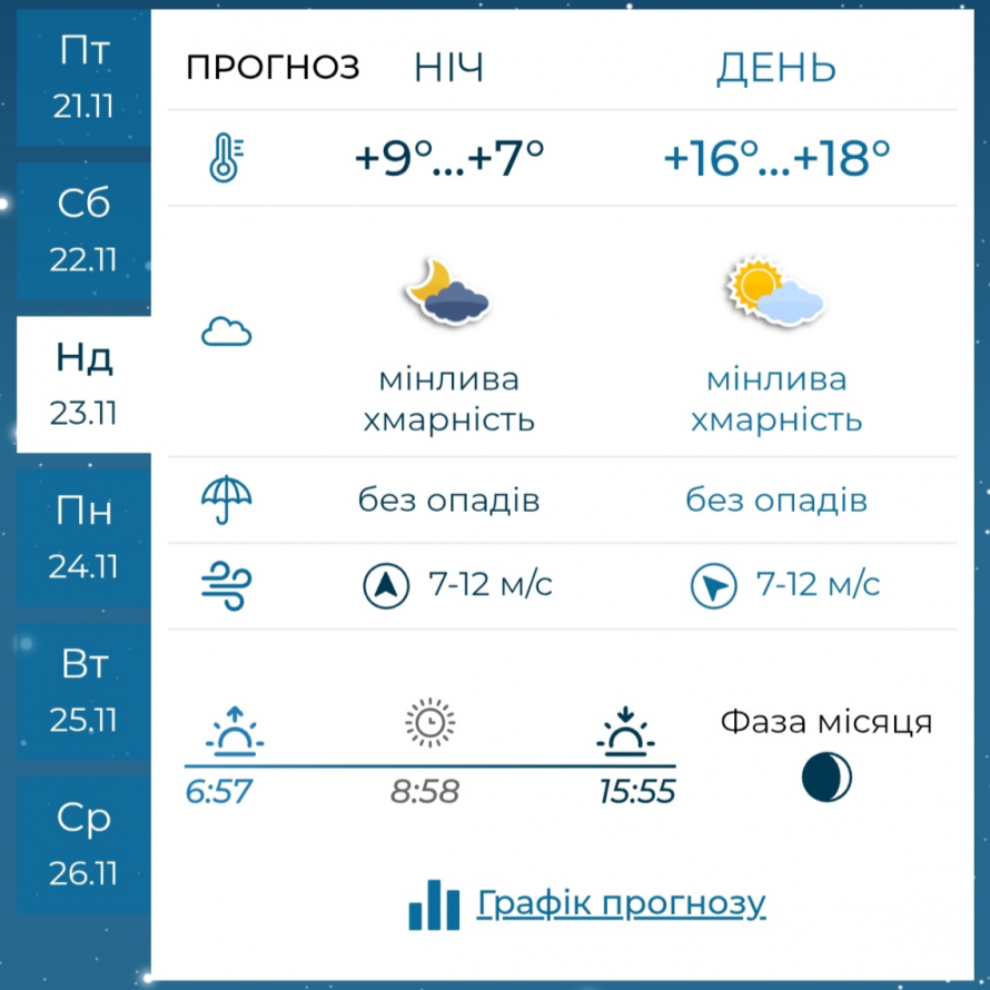 23 листопада, у неділю, в регіоні зберігатиметься мінлива хмарність, опадів не прогнозують. Ніч буде теплою, із температурою +9…+7°C та південним вітром.
