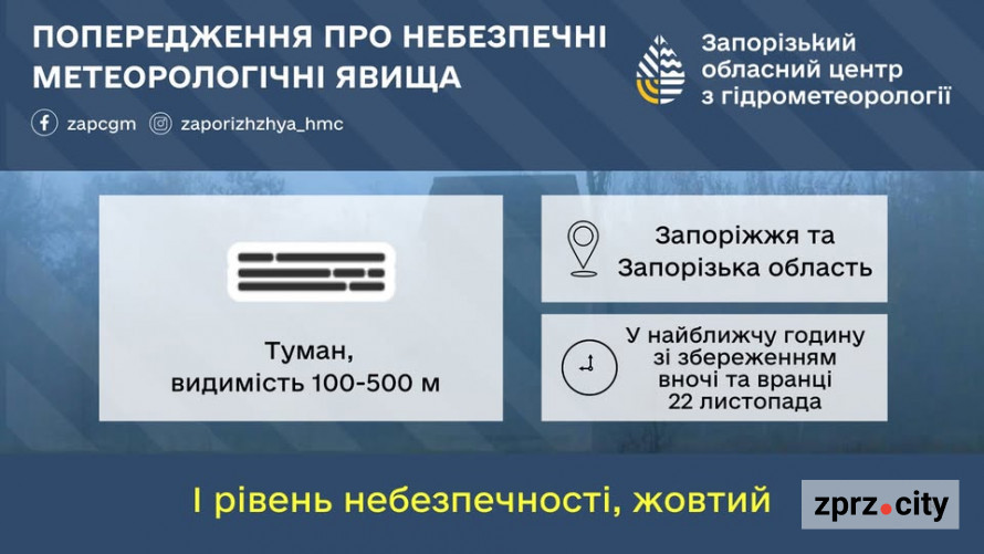 Вночі та вранці 22 листопада очікується туман, видимість 100-500 м (I рівень небезпечності, жовтий).