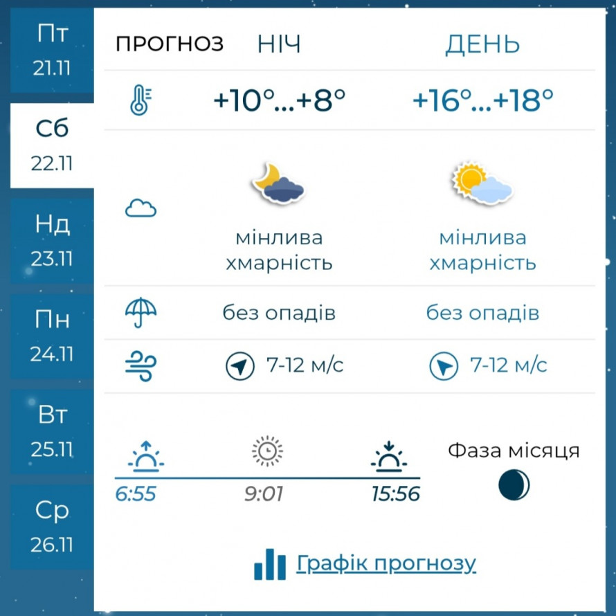 У суботу, 22 листопада, погода буде спокійною і комфортною. Вночі очікується мінлива хмарність, вітер південно-західний, швидкістю 7–12 м/с, температура становитиме +10…+8°C.