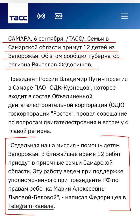 Паралельно губернатор самарської області Вячеслав Федорищев рапортував про розміщення 12 дітей із тимчасово окупованої території Запорізької області у місцевих родинах. Про це також повідомили російські державні медіа, зокрема ТАСС, зазначивши, що процес відбувався під кураторством омбудсменки Марії Львової-Бєлової, оголошеної МКС у розшук за викрадення українських дітей.