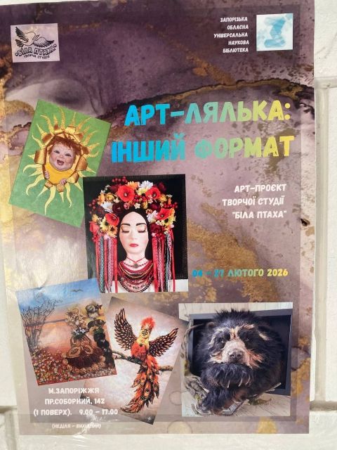 «Майстрині авторської ляльки творчої студії «Біла птаха» Запоріжжя представляють новий арт-проєкт «Арт-Лялька: Інший Формат», створений у відповідь на виклик простору, в якому проходить виставка.