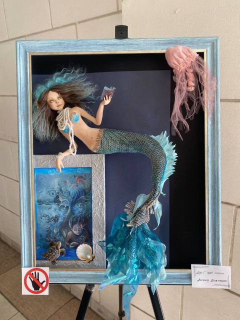 “Мрія про океан” — це картина в картині. Два роки тому я намалювала цю русалоньку, та картина більшого формату. А коли Віра запропонувала формат, де ляльку треба помістити в картину, у мене зразу з’явилася ідея — русалонька з книжкою на моїй невеличкій картині Щоб це була картина в картині. Так і склалося.