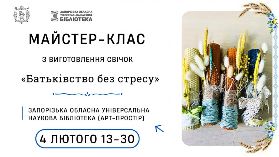 — 4 лютого 13.30 — майстер-клас з виготовлення свічок «Батьківство без стресу» від БФ «Посмішка ЮА», 18+. Матеріали надають організатори.