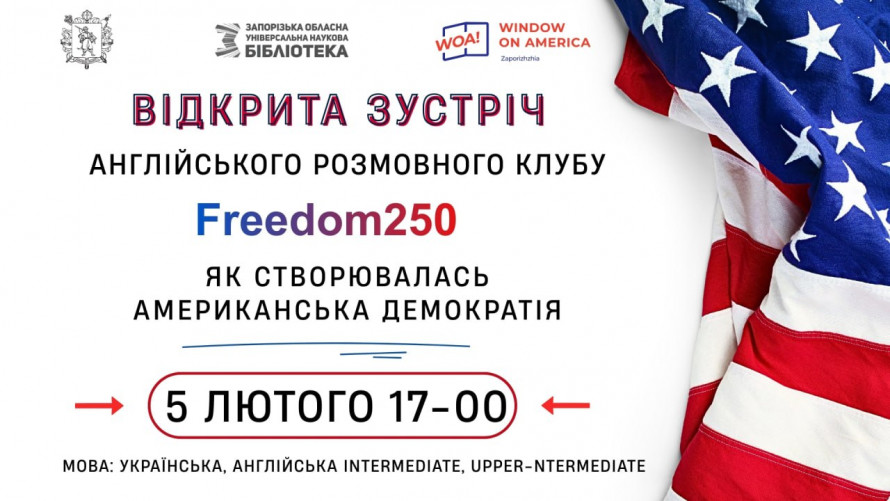 — 5 лютого о 17.00 — Центр «Вікно в Америку — Запоріжжя» запрошує на першу зустріч Англійського розмовного клубу в межах програми Freedom 250. Ведуча — філологиня і перекладачка учасниця міжнародної програми AIESEC (University of North Dakota, США) Юлія Мітюшина.