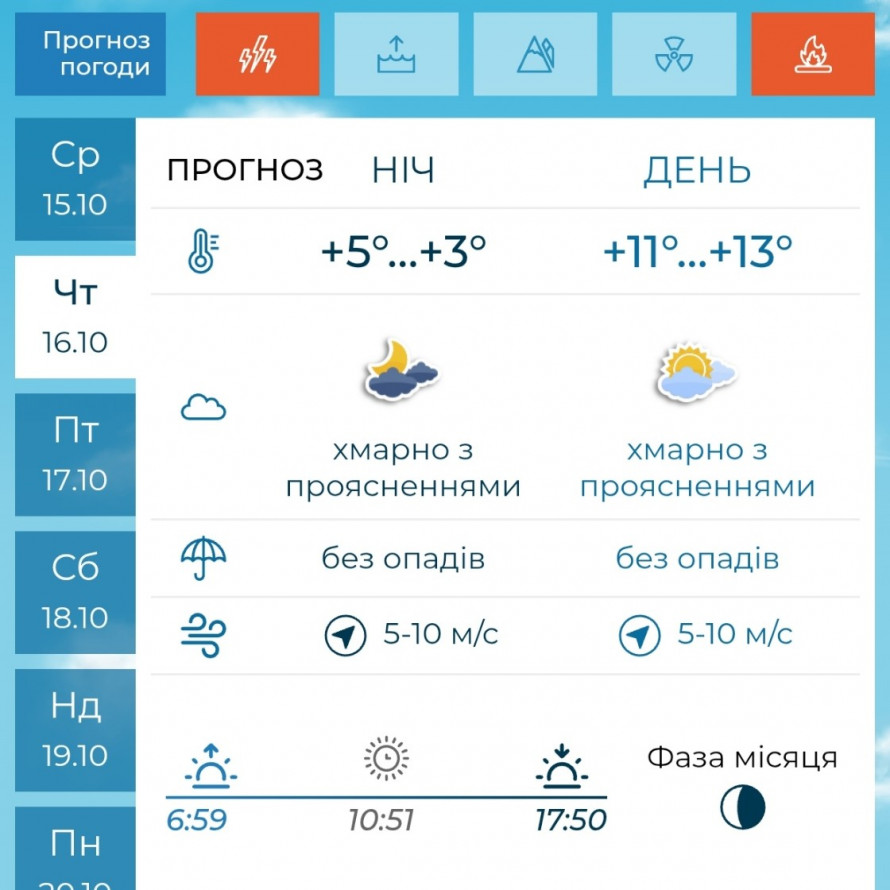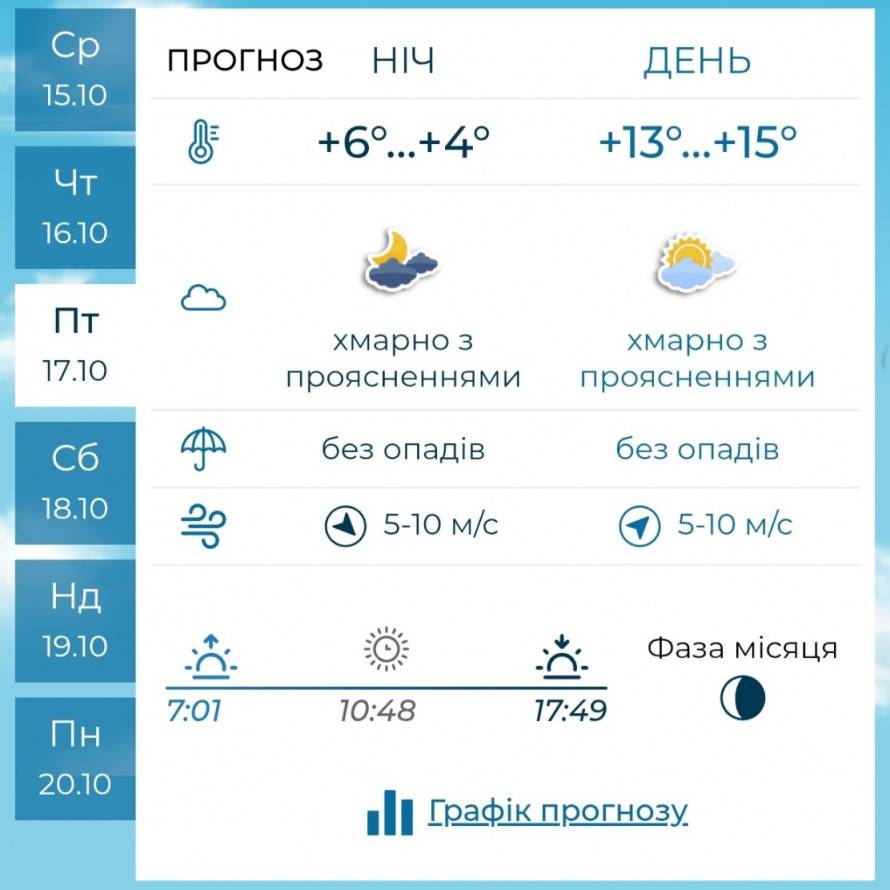 У п’ятницю, 17 жовтня, ситуація залишиться подібною: ніч буде прохолодною — +4°…+6°C, вдень температура підніметься до +13°…+15°C. Вітер змінних напрямків, помірний.