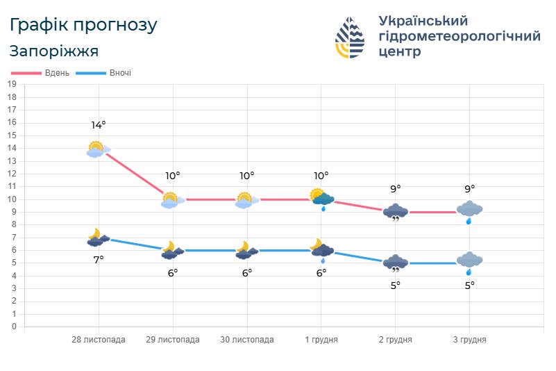У суботу, 29 листопада, в Запоріжжі очікується похмура погода з короткими проясненнями. Вдень температура підніметься до +9…+11°C, а вночі триматиметься на рівні +5…+7°C. Вітер — південно-східний, помірний, 5–10 м/с. За прогнозами синоптиків, опади цього дня малоймовірні, тож вихідний буде комфортним для прогулянок і поїздок.