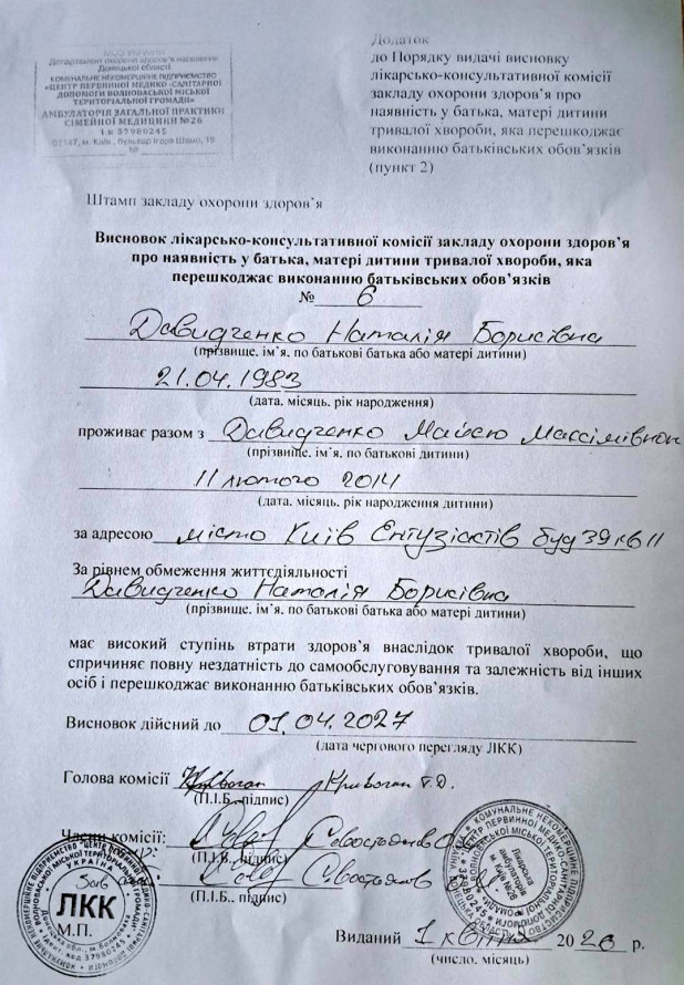 Мама Наталка зараз проходить справжнє ЛКК, щоб перекрити це липове, і це квест за кількістю аналізів та спеціалістів, хто проходив, той знає.
