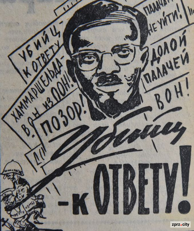 Запоріжсталівці одностайно вимагають суворого покарання вбивць Лумумби, вигнання з ООН лакея імперіалізму Гаммаршельда, виведення з Конго бельгійських військ».
