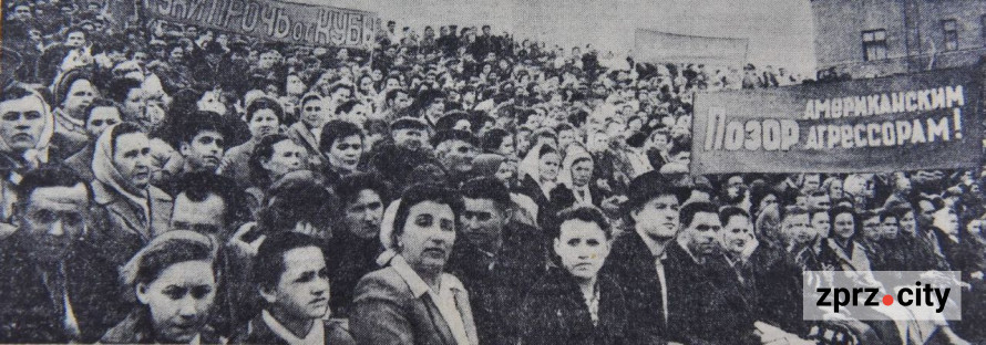 30-тисячний мітинг протесту трудящих Ленінського й Орджонікідзевського районів Запоріжжя на стадіоні «Металург». Звідси, як і з 17-тисячного мітингу трудящих Сталінського району, полетіли телеграми на адресу ООН та американського посольства в Москві