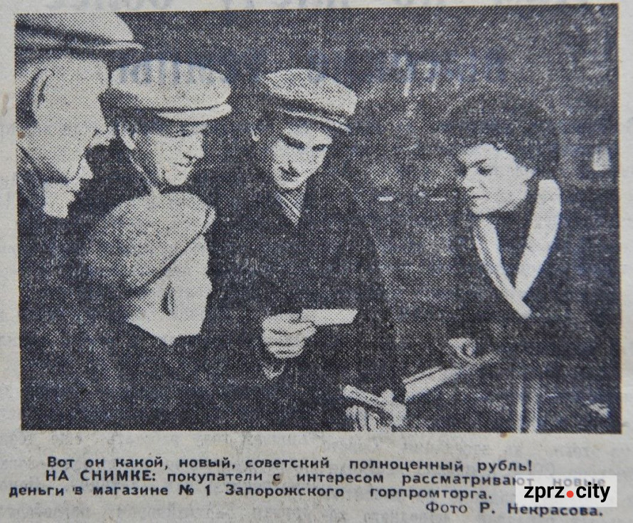 Запоріжці в магазині розглядають нові гроші. Фото з газети «Запорожская правда» (виходила тоді російською мовою)