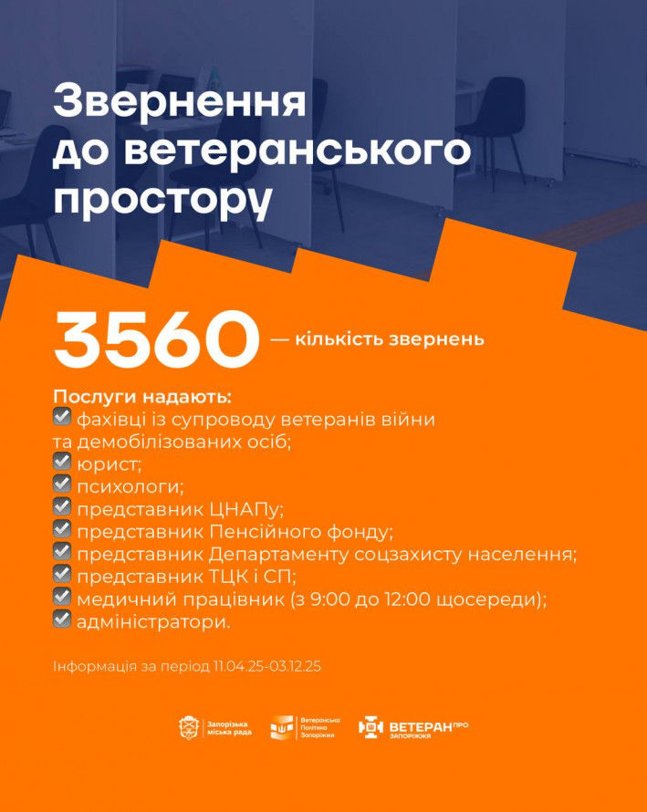 Загальна кількість звернень до центру з 11 квітня по 3 грудня 2025 року становить 3560. Послуги надають фахівці супроводу ветеранів, юристи, психологи, представники ЦНАП, Пенсійного фонду, департаменту соціального захисту населення, ТЦК і СП та медичні працівники.