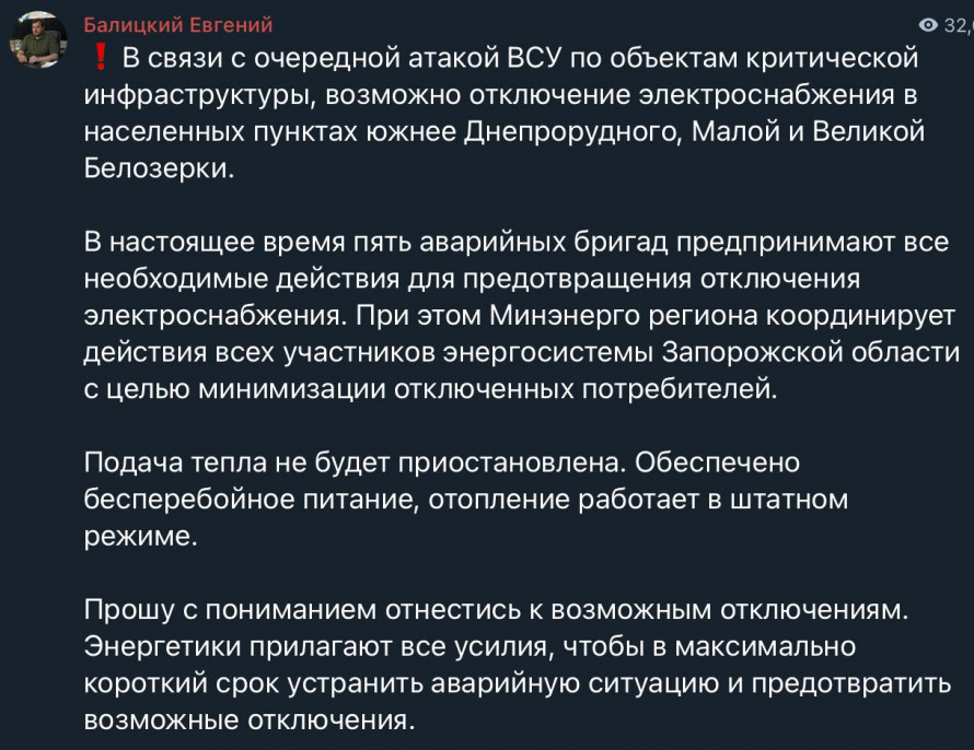 Після удару у Дніпрорудному та навколишніх районах зафіксовано щільний, безпросвітний блекаут. Окупаційна влада намагалася знизити паніку серед місцевих, але масштаби руйнувань очевидні.