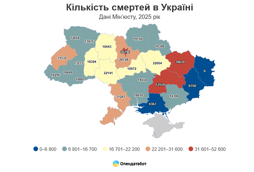 Що стосується смертності, найбільше померлих у Дніпропетровській області (52 559), Києві (36 296) та Харківській (34 670).