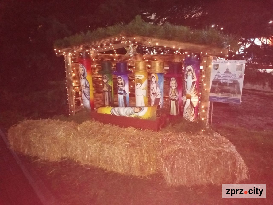 Запоріжжя, ТЦ «Україна» (центральний майданчик), вертеп розписаний майстрами та учнями арт-студії «Step Art», керівник Наталія Сміховська.
