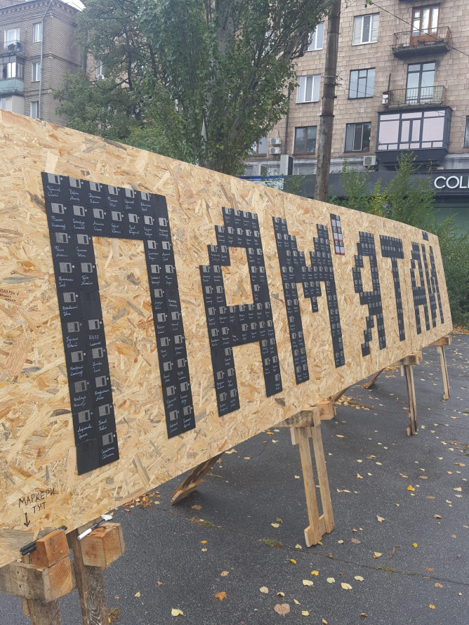 Це був особливий меморіал – на старих комп’ютерних дискетах, прикріплених до OSB-плит, написали імена військових та цивільних запоріжців, які загинули під час війни.
