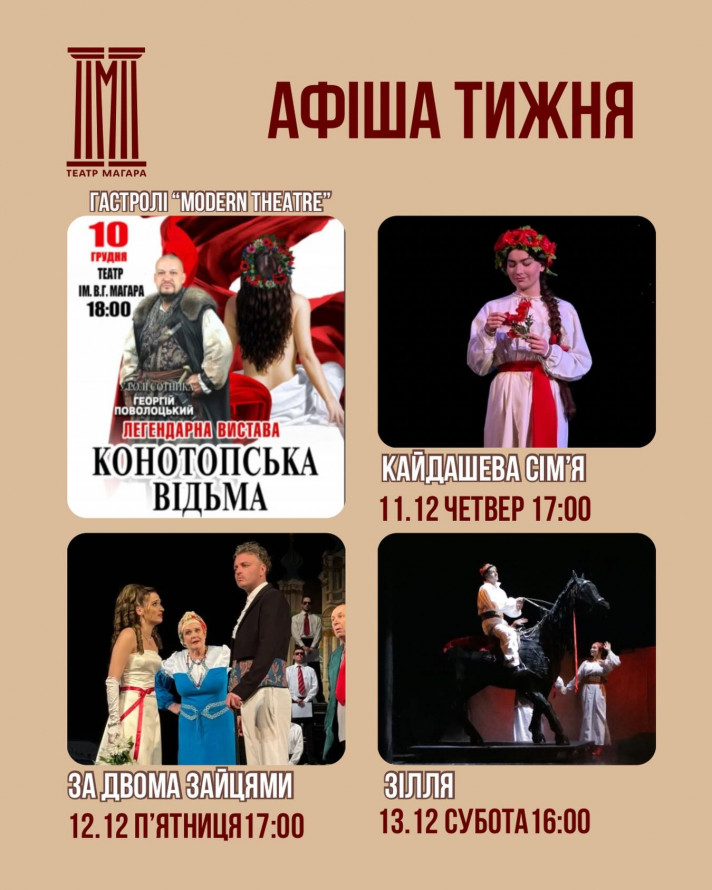 — 10 грудня о 18.00 — вистава «Конотопська відьма» за однойменною сатирично-фантастичною повістю Григорія Квітки-Основ’яненко театру “Modern Theatre” (Полтава).