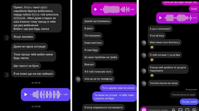 "Один з них мені написав сам, почав вибачатися. А перший каже: "Нє, ми не могли бить ногами людину, тим паче лежачу". Я записав їм голосове, на хвилину. Він каже "вибач". Але вже все, вже "вибач" не працює. Тим паче — в такій ситуації, я вам не вірю. Хлопець у мене питає, типу, скільки коштує квиток до Запоріжжя. Я відповідаю, що подивись сам. "Нє, ну напиши мені суму". Що я з нього вимагаю гроші типу".
