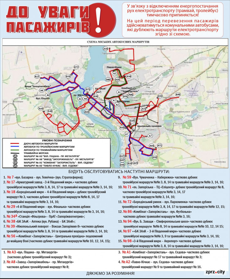 На сторінці Запоріжелетротранса також опублікували схему перевезень комунальними автобусами, які дублюють маршрути трамваїв і тролейбусів під час відключень електрики.