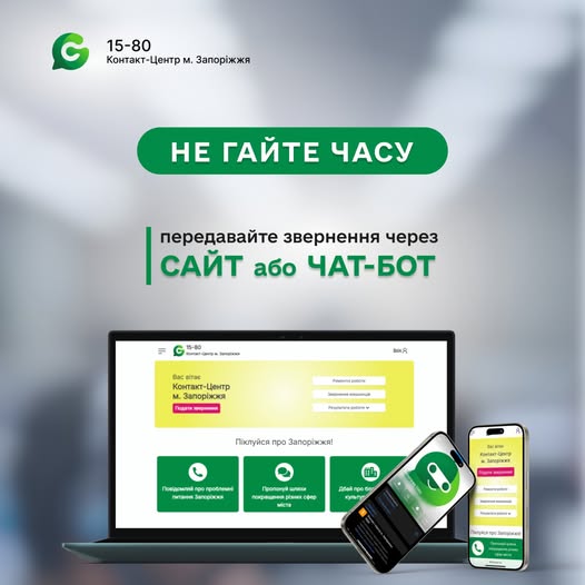 Запоріжцям нагадують, що передати заявку швидко та зручно можна через особистий кабінет на сайті контакт-центру «15-80» «КП «ЦУІТ» або через Чат-бот «Запоріжжя 1580». У випадку подачі звернень в електронному вигляді в особистому кабінеті мешканця можна відстежувати статус звернень та хід виконання робіт, дізнаватись інформацію щодо відключень послуг, отримати консультацію тощо.