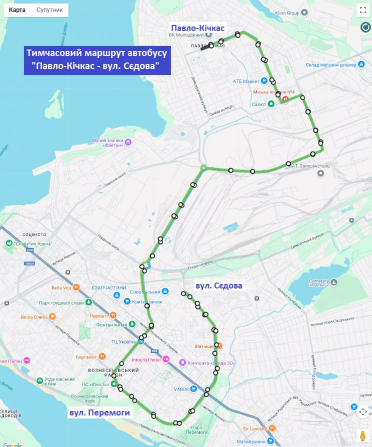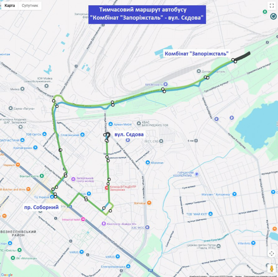— додатковий автобус «Комбінат «Запоріжсталь» — вулиця Сєдова» за напрямком: Комбінат “Запоріжсталь” — Південне шосе — вулиця Діагональна — вулиця Вячеслава Зайцева — проспект Соборний — вулиця Якова Новицького — вулиця Сєдова;
