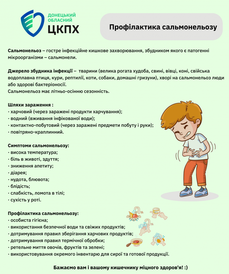 «Захворювання виникає переважно через вживання м’яса та інших продуктів тваринництва та птахівництва «забруднених» збудником – від хворих на сальмонельоз тварин, або коли в готові страви збудник потрапляє через брудні руки хворої на сальмонельоз людини чи безсимптомного носія інфекції».