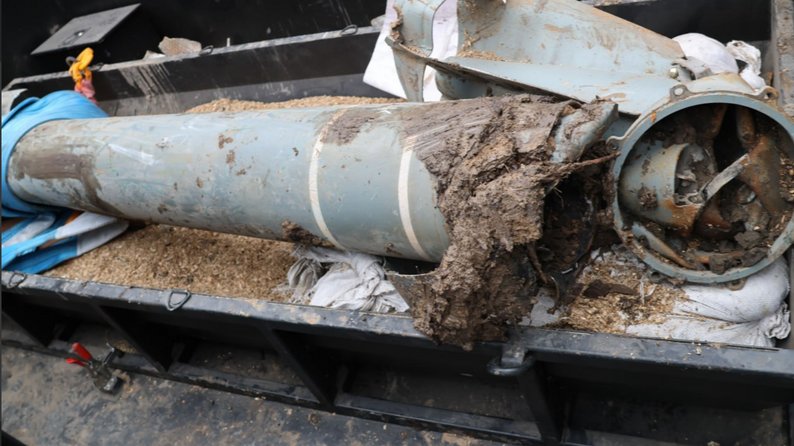 Залишки реактивного снаряда, котрі виявили у Запоріжжі поблизу проїжджої частини. ГУ ДСНС України у Запорізькій області