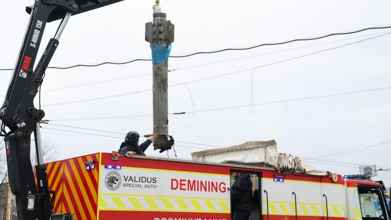 Сапери ДСНС транспортують залишки снаряда від РСЗВ, виявлені у Запоріжжі. ГУ ДСНС України у Запорізькій області