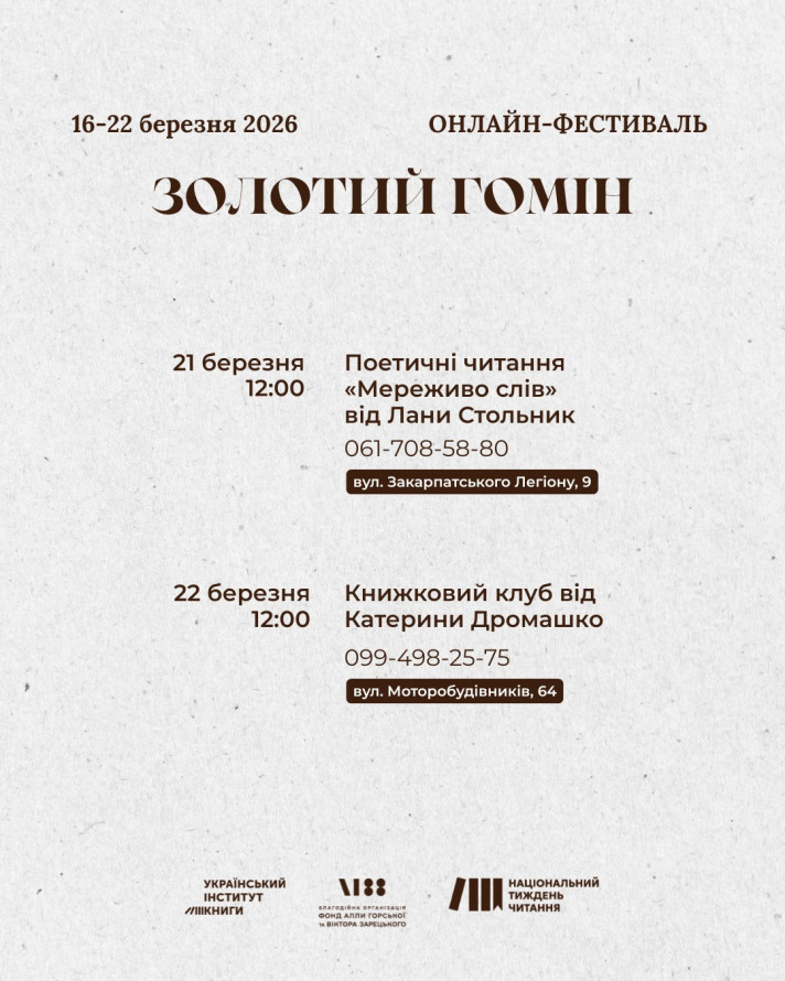 З 16 до 22 березня в Україні втретє відбудеться Всеукраїнська інформаційно-просвітницька акція «Національний тиждень читання поезії», яку організовує Український інститут книги. Тема цього року — «Золотий гомін», натхненна однойменною ліричною поемою Павла Тичини.