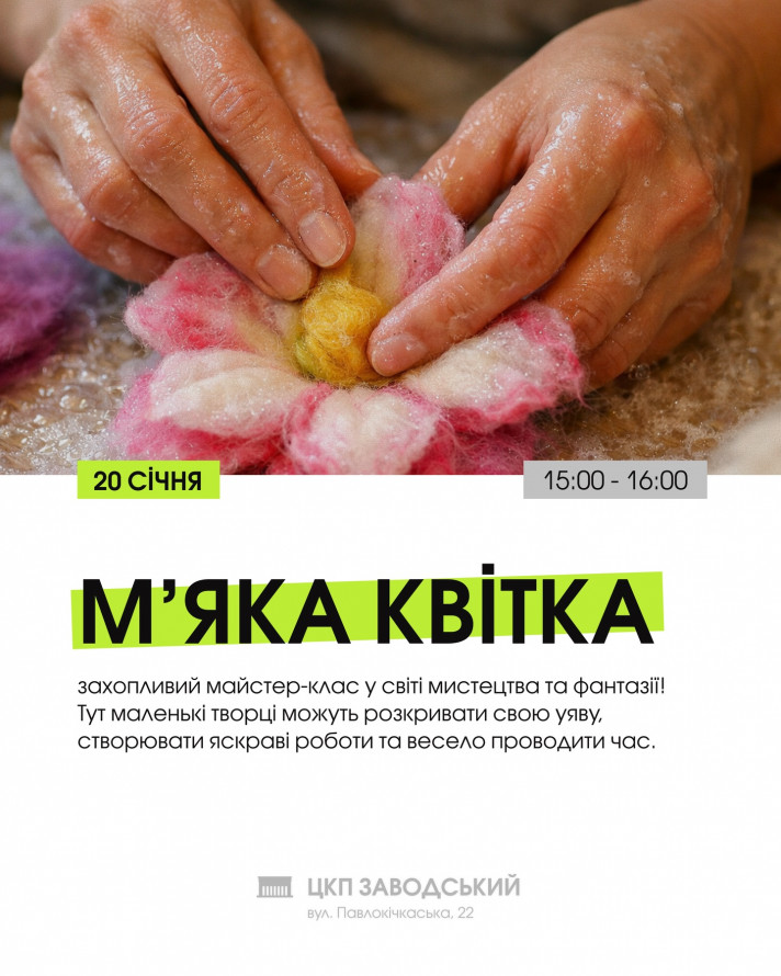 — 20 січня о 15.00 — майстер-клас «М’яка квітка», у ЦКП «Заводський».