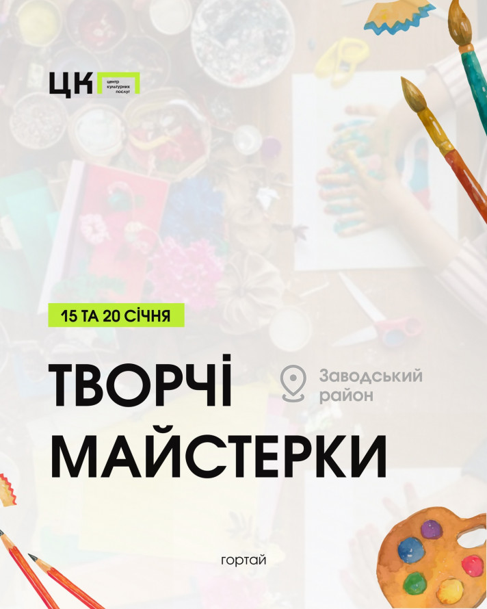 — 15 січня о 15.00 — творчий майстер-клас для дітей у ЦКП «Заводський».