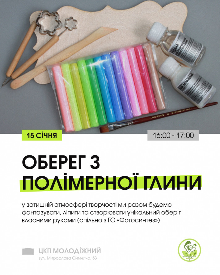 — 15 січня о 16.00 — майстер-клас №Оберег з полімерної глини», у ЦКП «Молодіжний».