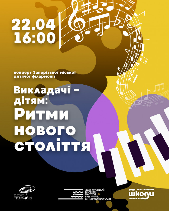 — 22 квітня о 16.00 Запорізька міська дитяча філармонія запрошує на концерт нового формату «Викладачі – дітям: Ритми нового століття».