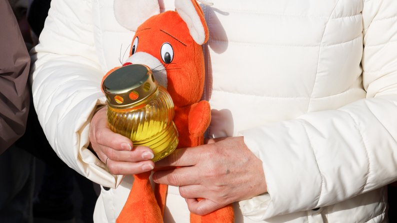 Лампадка та дитяча іграшка у руках жительки Запоріжжя як знак вшанування пам’яті загиблих внаслідок обстрілу РФ Маріупольського драмтеатру навесні 2022 року. ЗОВА