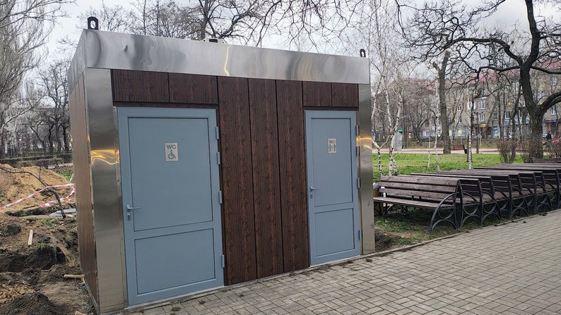Так, на місці виставки художників, станом на 23 грудня вже вимощено фундамент, на який встановлено модульну конструкцію туалету з розділенням на жіночу й чоловічу вбиральню та туалет для людей з інвалідністю.