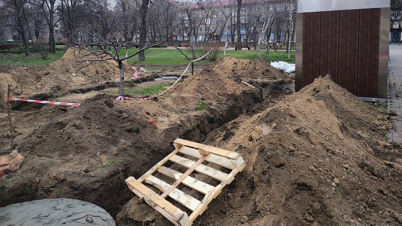 Поблизу громадської вбиральні тривають роботи з підʼєднання водопостачання та водовідведення до новозбудованого обʼєкта. За даними з системи Prozorro, договір на реконструкцію мереж водопостачання та водовідведення для підключення паркового туалету у сквері Митців був підписаний 17 грудня 2025 року.