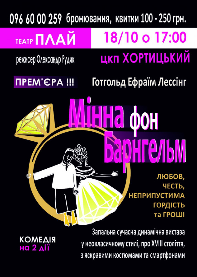 — 18 жовтня о 17.00 — прем’єра комедії «Мінна фон Барнгельм» по п’єсі німецького драматурга ХVІІІ століття Готгольда Ефраїма Лессінга «Мінна фон Барнгельм, або Солдатське щастя», у сучасному переосмисленні. У ЦКП «Хортицький».