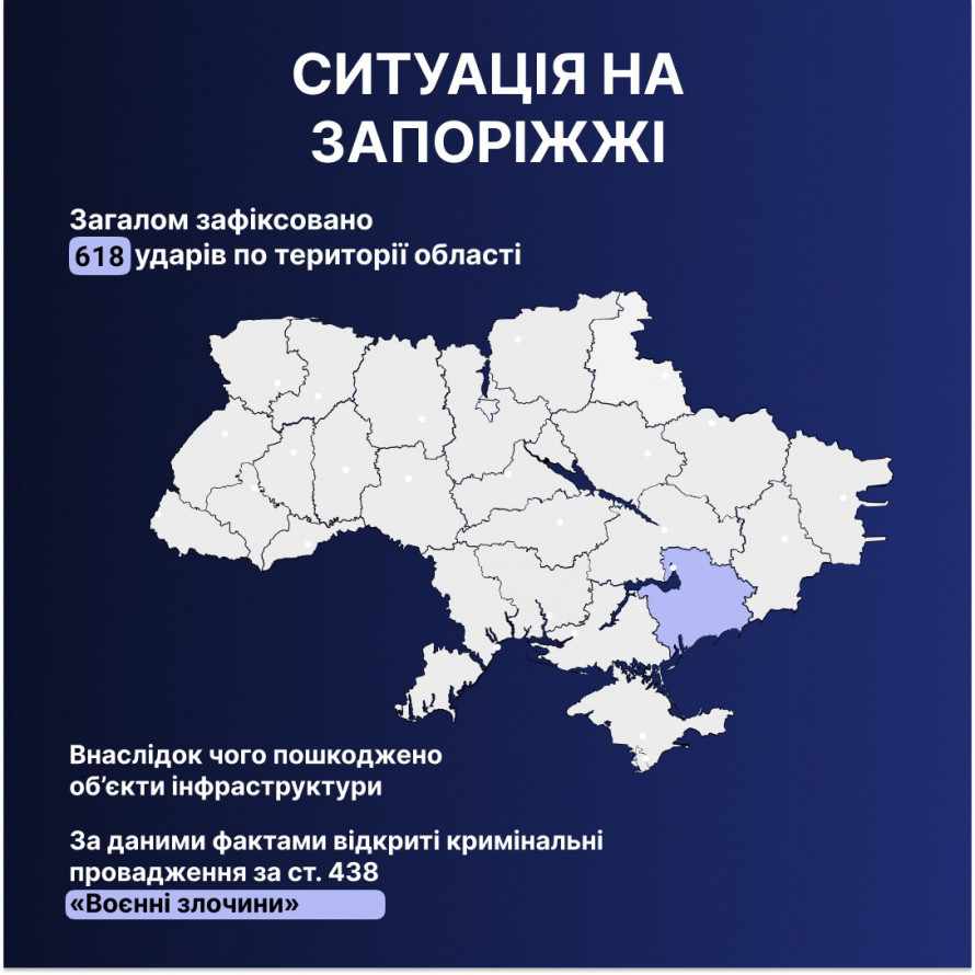За минулу добу ворог 618 разів обстріляв 18 населених пунктів Запорізької області. А саме, 16 серпня російські військові скерували по мирних містах і селах області 411 безпілотників (переважно FPV), 195 разів вдарили з артилерії, 9 — з авіації та 3 рази застосували для атак реактивні системи залпового вогню.