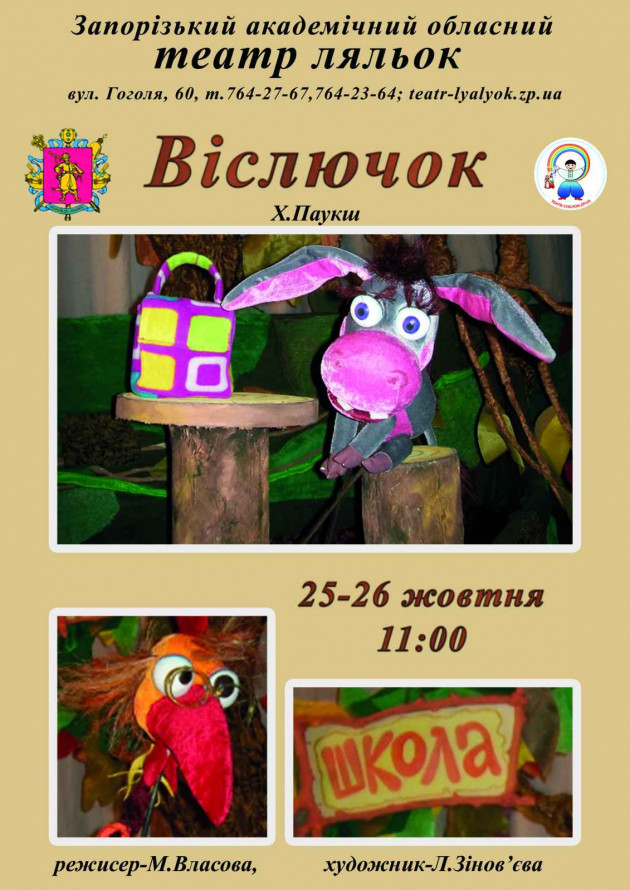 У найближчі вихідні, 25 і 26 жовтня, в Запорізькому академічному театрі ляльок відбудеться прем’єра оновленої вистави «Віслючок» за п`єсою латвійського драматурга Херманіса Паукша у постановці режисерки Марічки Власової. Це добра та кумедна казочка про важливість навчання.