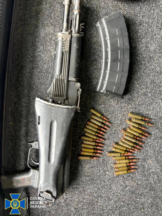 Під час обшуків у затриманого вилучили два автомати АК-74, три ручні гранатомети РПГ-7, три постріли до гранатомета, ручну осколкову гранату та набої калібру 5,45 мм.