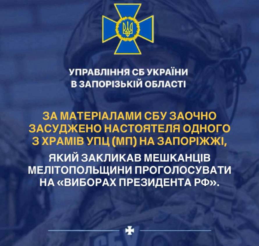 Слідчі Служби безпеки України встановили, що після початку повномасштабного вторгнення священнослужитель систематично поширював проросійські наративи серед мешканців тимчасово окупованої Мелітопольщини.