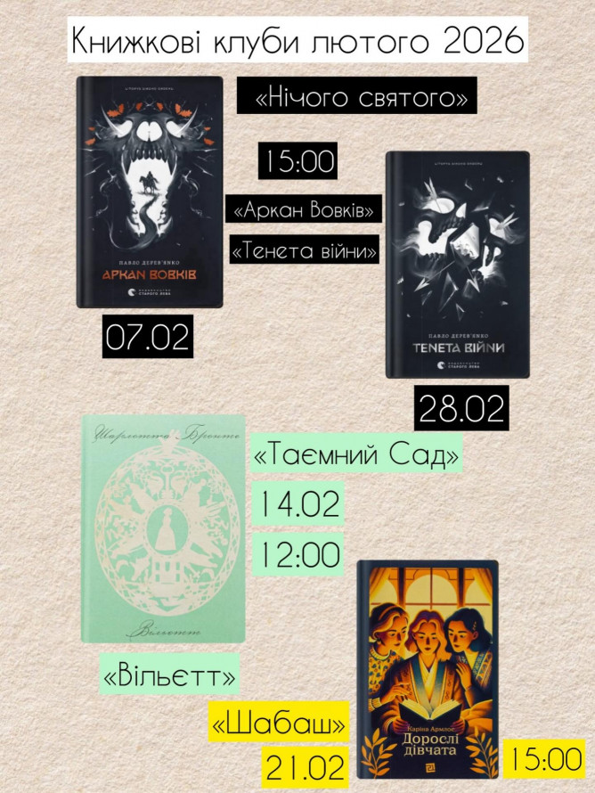Так, 21 лютого о 15.00 відбудеться зустріч книжкового клубу «Шабаш», обговорення побутово-психологічного роману, родинної саги «Дорослі дівчата» Каріни Армлос.