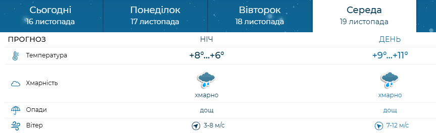 Середа, 19 листопада. Вночі +6…+8 °C, вдень +9…+11 °C. Хмарно, протягом доби — дощ. Вітер: уночі південно-західний 3–8 м/с, удень південно-східний 7–12 м/с. У середу відчутно похолодає, а дощ стане стабільним супутником дня.