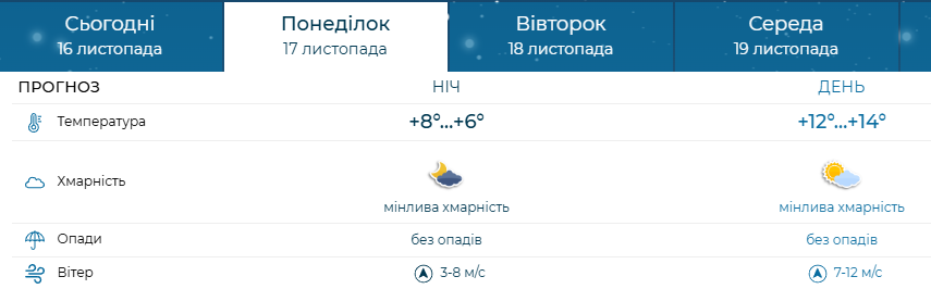 За прогнозом Укргідрометцентру, в понеділок, 17 листопада вночі очікується +6…+8 °C, вдень +12…+14 °C. Мінлива хмарність, проте без опадів. Південний вітер: уночі 3–8 м/с, удень 7–12 м/с. Початок тижня обіцяє бути сухим і відносно теплим, хоч і вітряним.