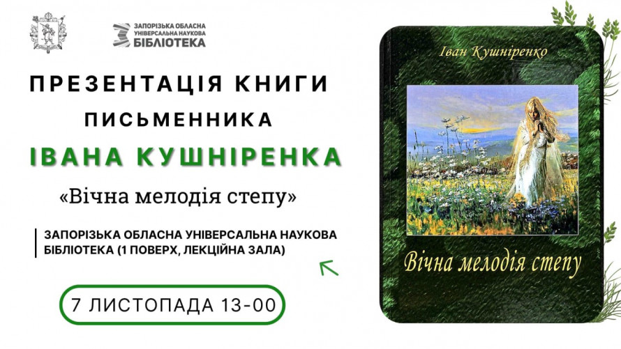 7 листопада о 13.00 у Запорізькій обласній універсальній науковій бібліотеці відбудеться презентація книги «Вічна мелодія степу» члена Національної спілки письменників України та Національної спілки журналістів України Івана Кушніренка. (Вхід вільний).