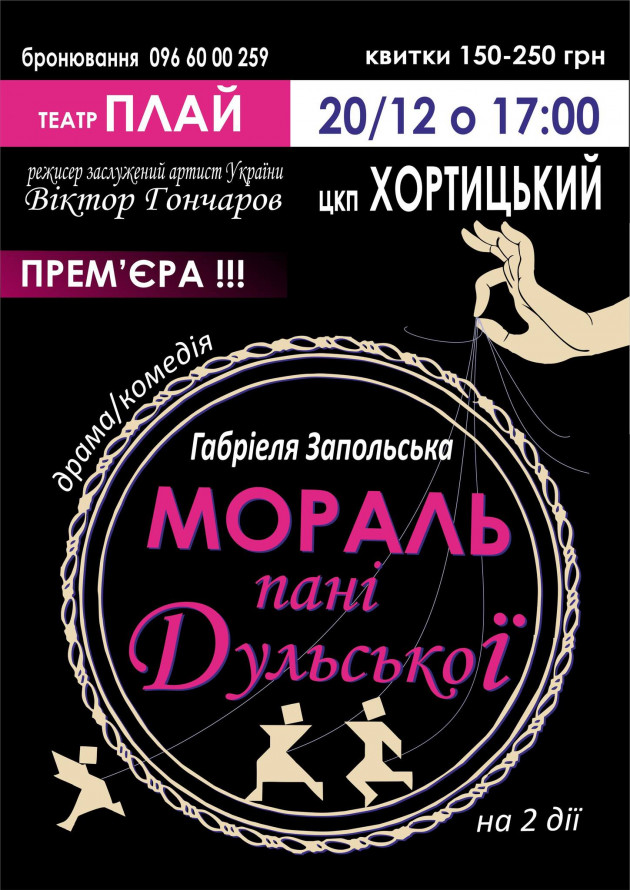 — 20 грудня о 17.00 — прем’єра трагікомедії «Мораль пані Дульської», у ЦКП “Хортицький” (просп. Преображенського, 15).